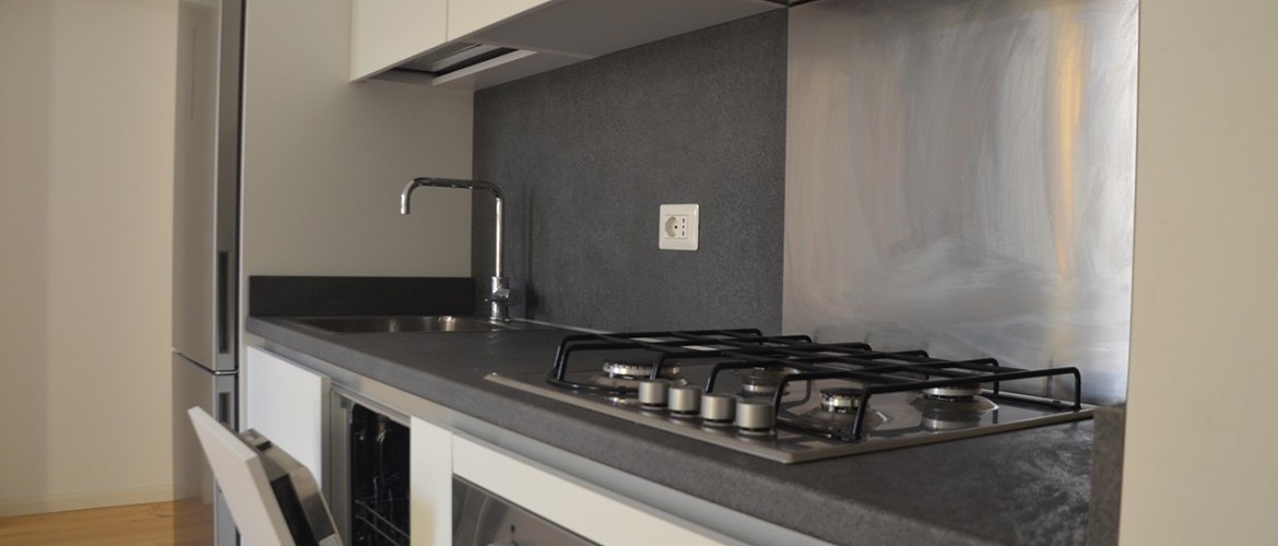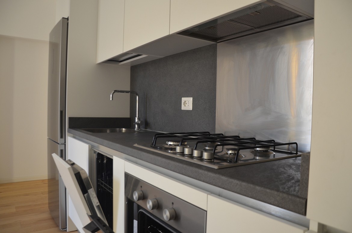 Il bilocale, mai abitato, viene consegnato semi-arredato con cucina a vista dotata di cucina a gas, frigorifero, forno e lavastoviglie oltre a pensili e bagno con lavandino, sanitari e cabina doccia.